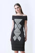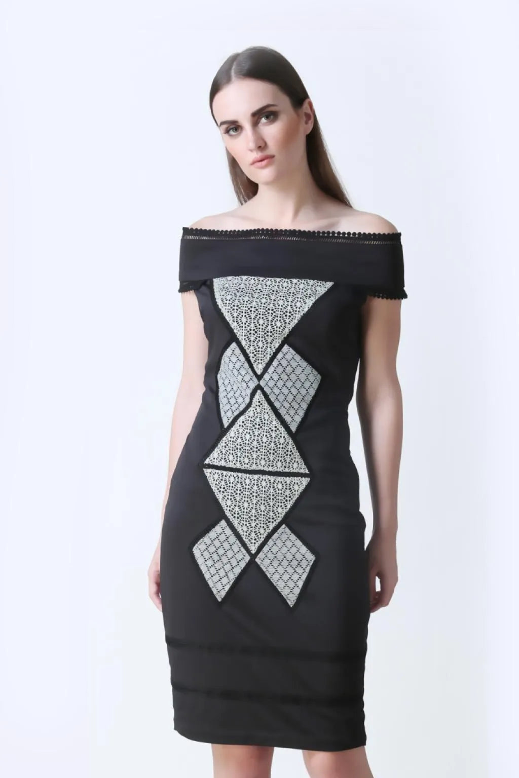 Black off shoulder dress with patched lace tesselate patterns in grey . Made of heavy imported georgette and lace .It is strechable and breathable fabric, gives a great fit . Dry clean only.