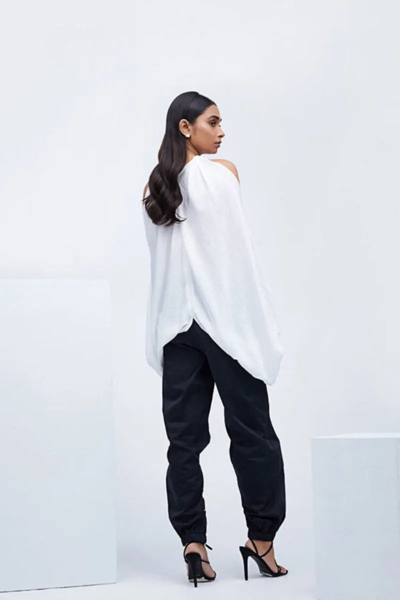 The Ecru Lava top is crafted from luxurious satin, offering a flattering fall on all body types. It features detailed gathered sleeves, a stylish shoulder cut-out, and a unique, effortless silhouette. This versatile top is perfect for any formal event, party, or get-together. It can be dressed up in multiple ways, pairing beautifully with pants, skirts, or even styled as a dress.