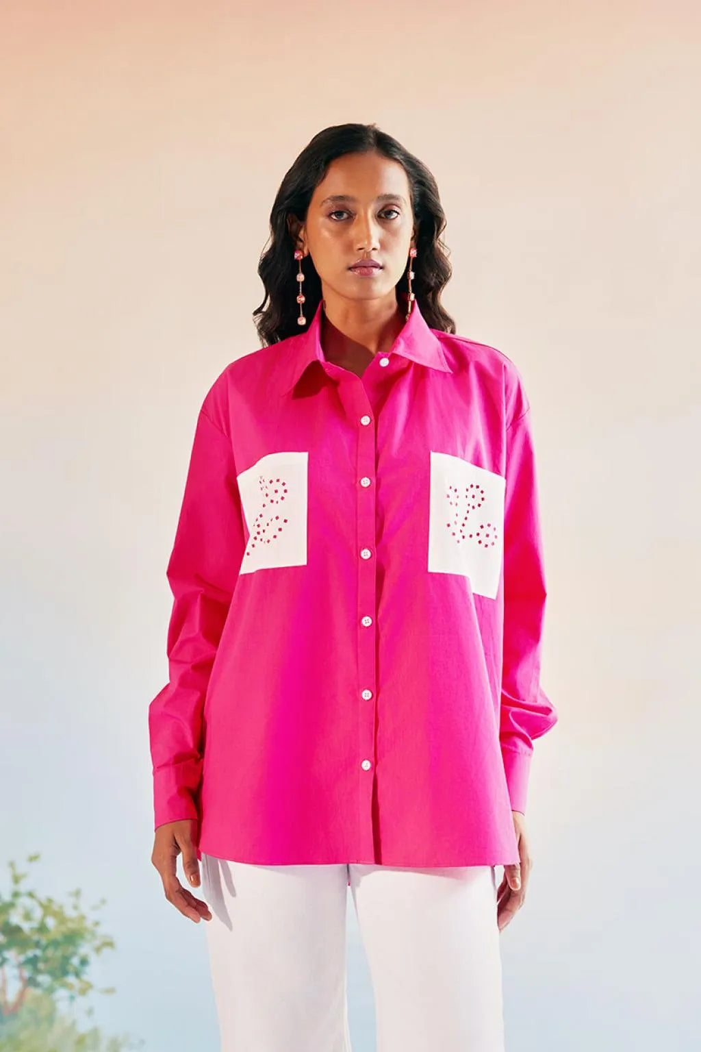 Introducing the Echo Flora Shirt: Crafted from premium 100% cotton fabric, this summer essential features a charming patchwork design pocket adorned with intricate flower cut details. In a delightful summer pink hue, this shirt exudes freshness and vitality, perfect for the season. With full sleeve design and comfortable, breezy fabric, it offers both style and comfort. The Echo Flora Shirt in a classic shirt design with contrasting patch work pockets is the perfect choice for any occasion. Pair it with comfortable pants or denim to create versatile and stylish looks that will keep you feeling cool and confident all summer long.