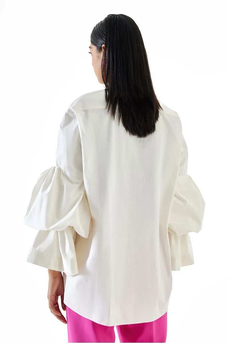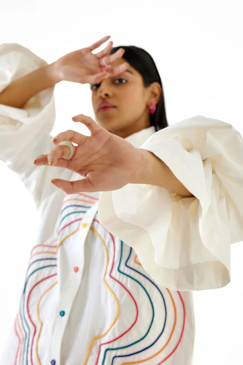 The echo flower dress is relaxed cotton shirt with flower piping in multi color . The flower threads add a pop to this white shirt. The sleeves are unique , they flounce and flare giving it a great form . This shirt is not your regular white shirt , but is very wearable. The colorful buttons add to the look of this shirt . All the elements come together beautifully to make this a must have in every wardrobe.