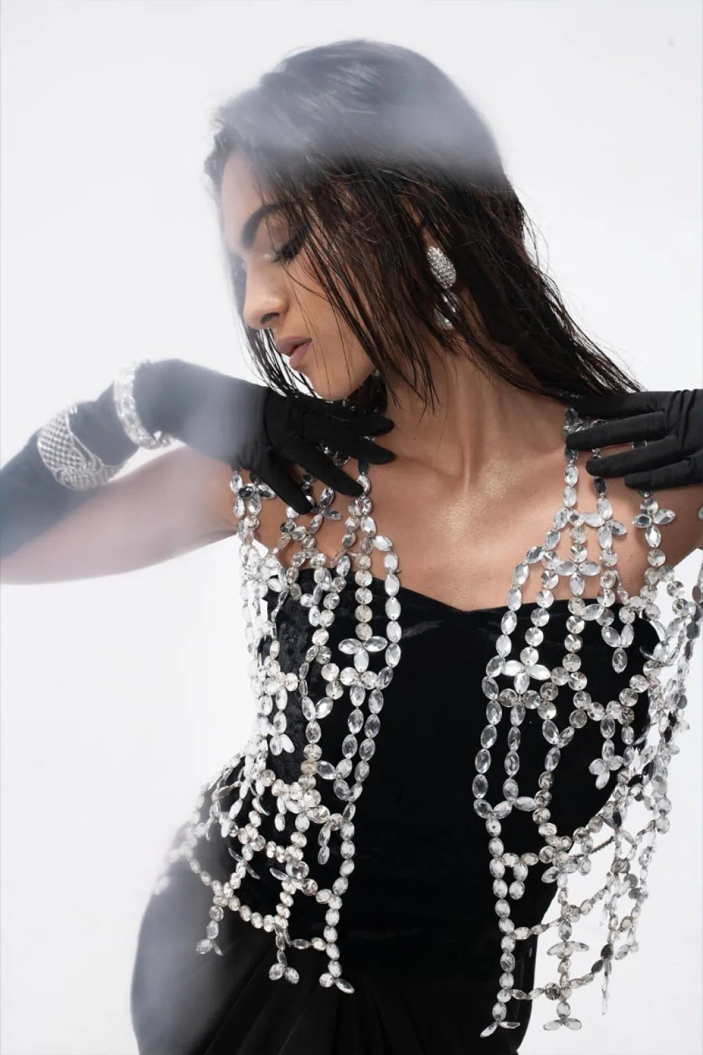 Introducing our inaugural accessory, meticulously crafted with passion and precision. The Echo Gemme Jacket is a stunning, one-of-a-kind piece featuring gorgeous glass stones in high-quality settings, perfect for luxury fashion enthusiasts and connoisseurs of haute couture.This exquisite jacket is handcrafted with dedication and attention to detail, ensuring a truly unique and exclusive ownership experience. The free-size design allows for versatility, enabling you to style it in multiple ways to add a touch of glamour, sophistication, and elegance to any outfit, from formal wear to party dresses.