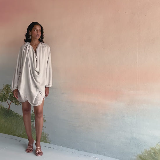 Echo Lala Dress, crafted from luxurious satin for a smooth, elegant drape. This short dress features a chic front cowl effect, full sleeves, and a subtle back-neck button with a long side slit for added sophistication. Perfect for evening events or special occasions, it flatters all body types—offering the ideal blend of glamour, comfort, and modern style.