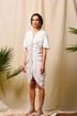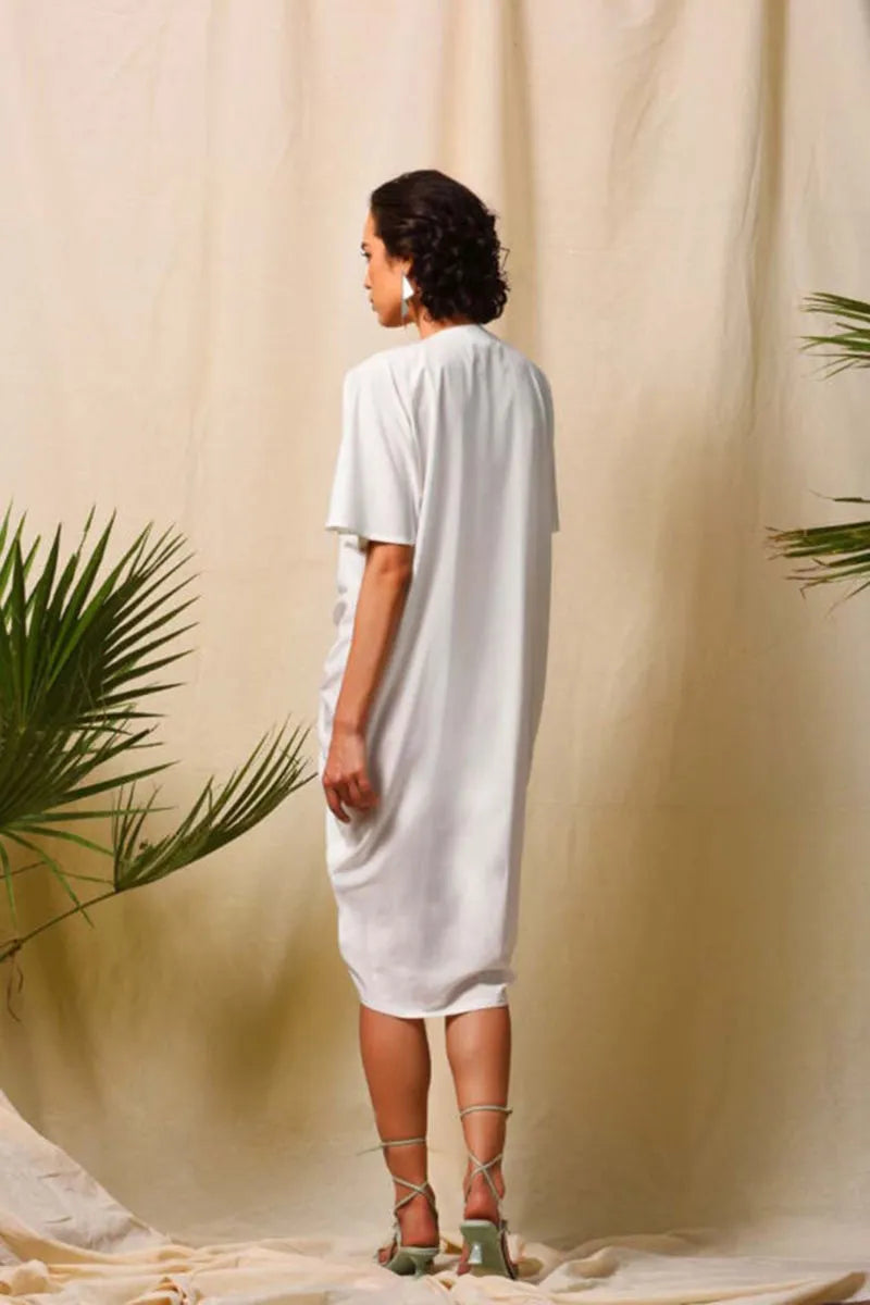 This white tie- up dress has a loose fit and Is made from imported crepe fabric .the adjustable tie up gives the dress a unique shape . The fit of the dress is flattering for any body type . This dress can be a great addition to your vacation wardrobe this season.