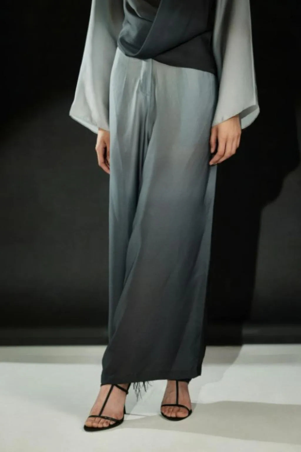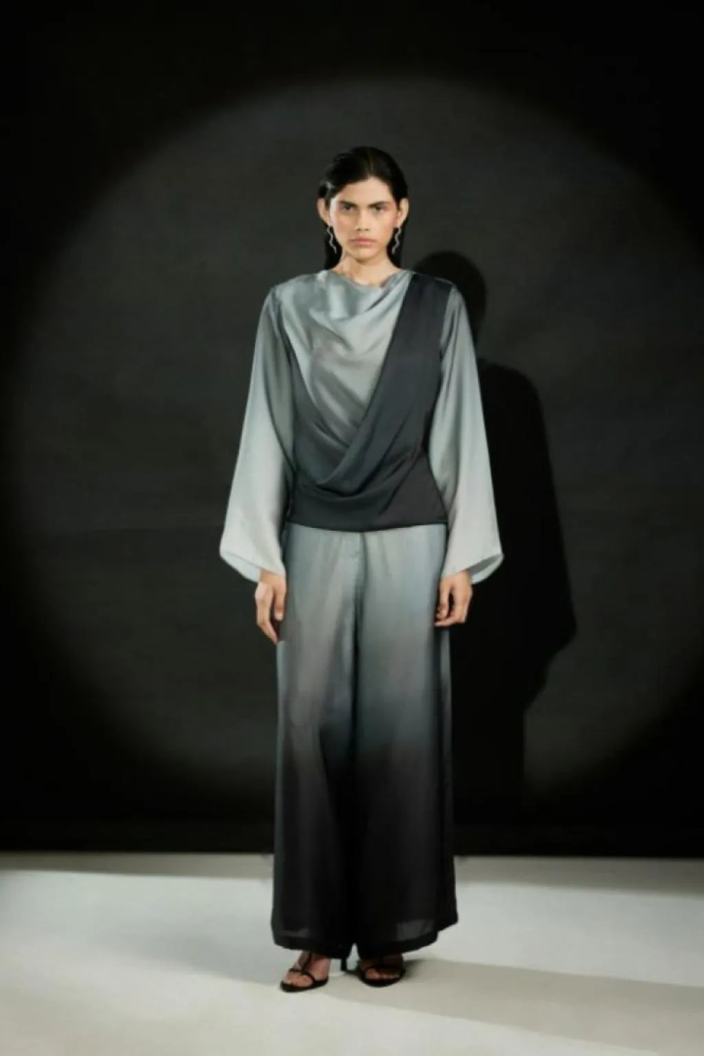 Echo Midnight coord set a fusion of chic design and luxurious comfort. This set features a top with a gracefully draped cowl, seamlessly transitioning from black to grey in a captivating ombre pattern. Paired with loose pants crafted from silky satin, this ensemble exudes modern sophistication and is designed to make you stand out with effortless style .Black to grey ombre pattern, creates a visually striking and on-trend look. The transition from deep black to soft grey adds depth and dimension to the ensemble. The top is adorned with a gracefully draped cowl, adding an element of understated glamour.