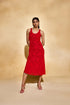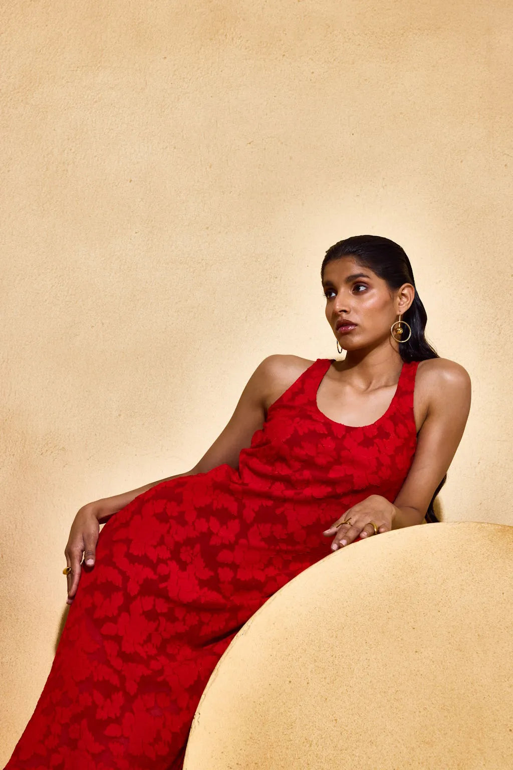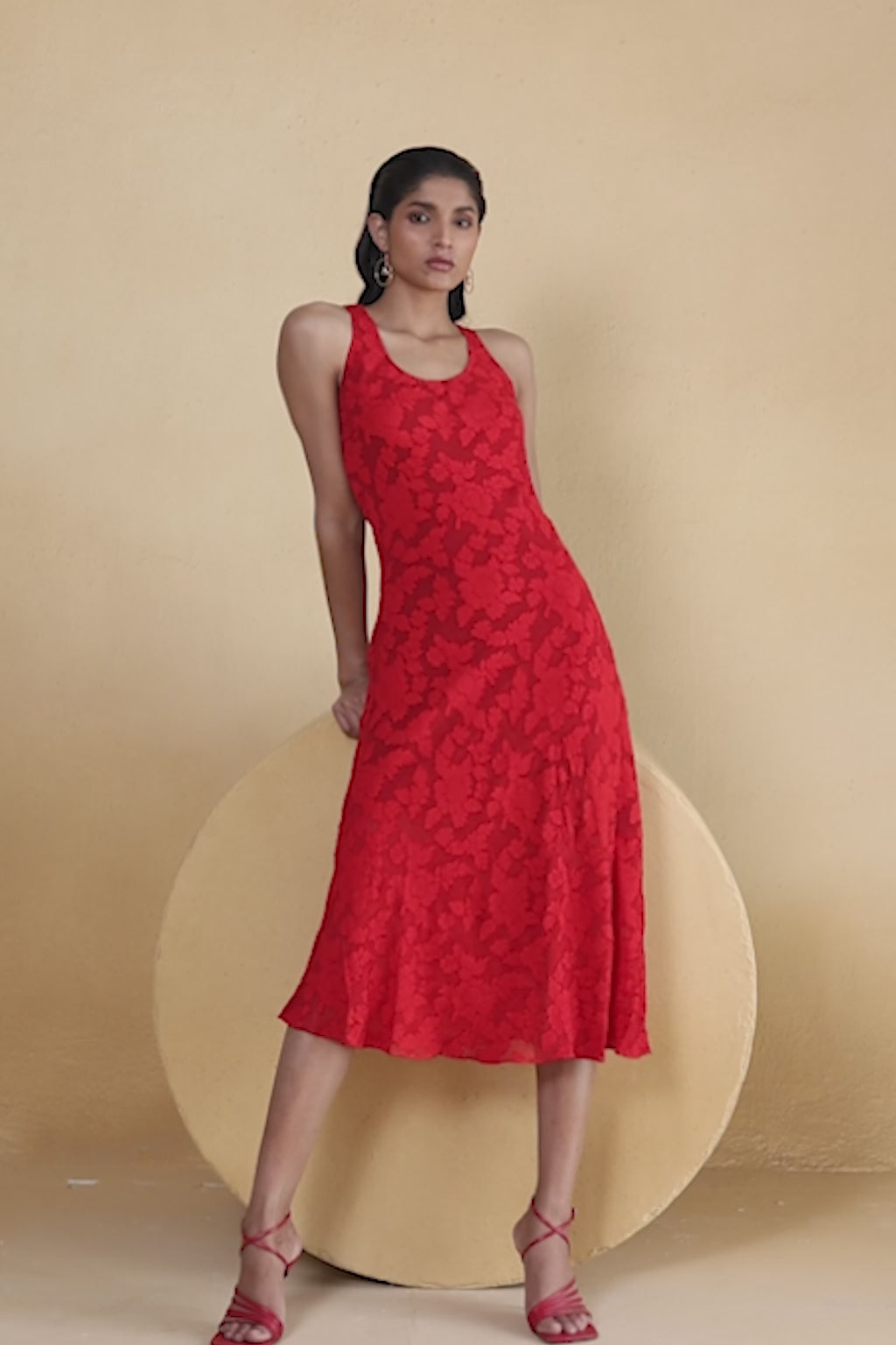 A bold silhouette in bloom. Crafted in a vivid red floral jacquard, this midi-length dress skims the body with fluid elegance. The scoop neckline and sleeveless cut keep it modern and minimal, while the rich texture adds depth and dimension. Designed to transition seamlessly from daytime ease to evening edge.