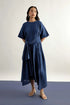 The navy ridge dress is a comfortable breathable piece . The fit is loose but the side knot tie up makes the fall of this dress unique . The front pleats and asymmetrical length are an element that add to the understated design of the dress . This is a staple dress for summer.