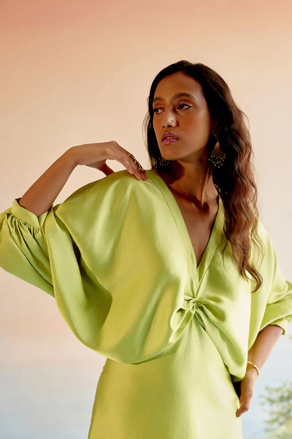 Echo Palma Dress, crafted from luxurious imported satin for an elegant, resort-ready look. Featuring a flattering V neckline, gathered front, and fitted waistline, it combines effortless grace with modern sophistication. The loose sleeves and straight silhouette ensure comfort and fluid movement—perfect for vacations, beach strolls, or evening soirées. Available in stunning colors, the Echo Palma Dress is your statement of timeless elegance.