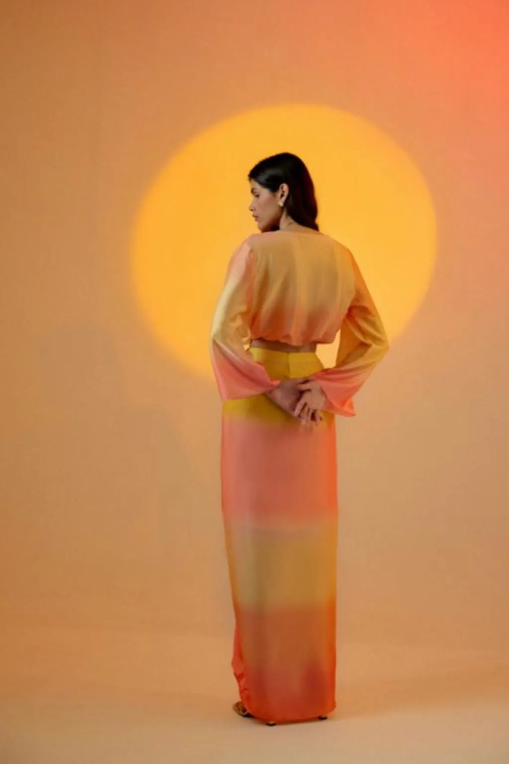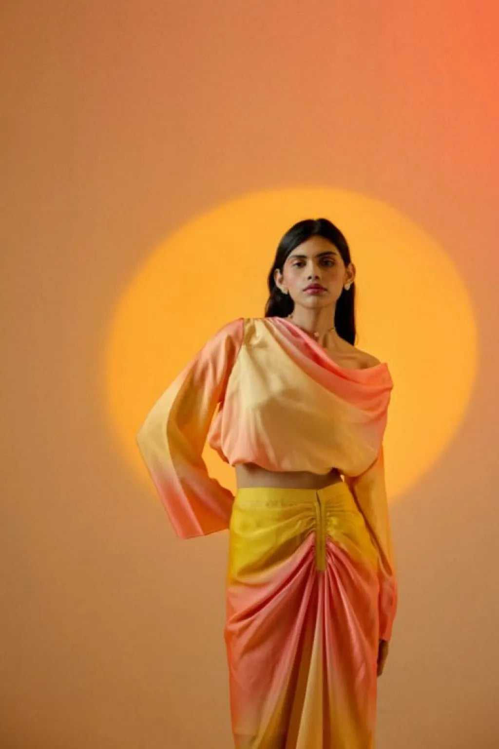 Echo Tea rose skirt set – a vibrant and stylish ensemble designed to captivate attention and radiate modern femininity. The set features a cropped top with full sleeves and a graceful cowl neck, perfectly paired with a skirt adorned with ruched detailing on the waist, a side zipper, and an asymmetrical length. Get ready to embrace the playful beauty of ombre colors and contemporary design. A lively ombre effect in luxurious satin adds a burst of color and energy to your outfit .The side zipper ensures easy wearability, allowing you to slip into this charming set effortlessly. This detail adds convenience without compromising the sleek and streamlined appearance .