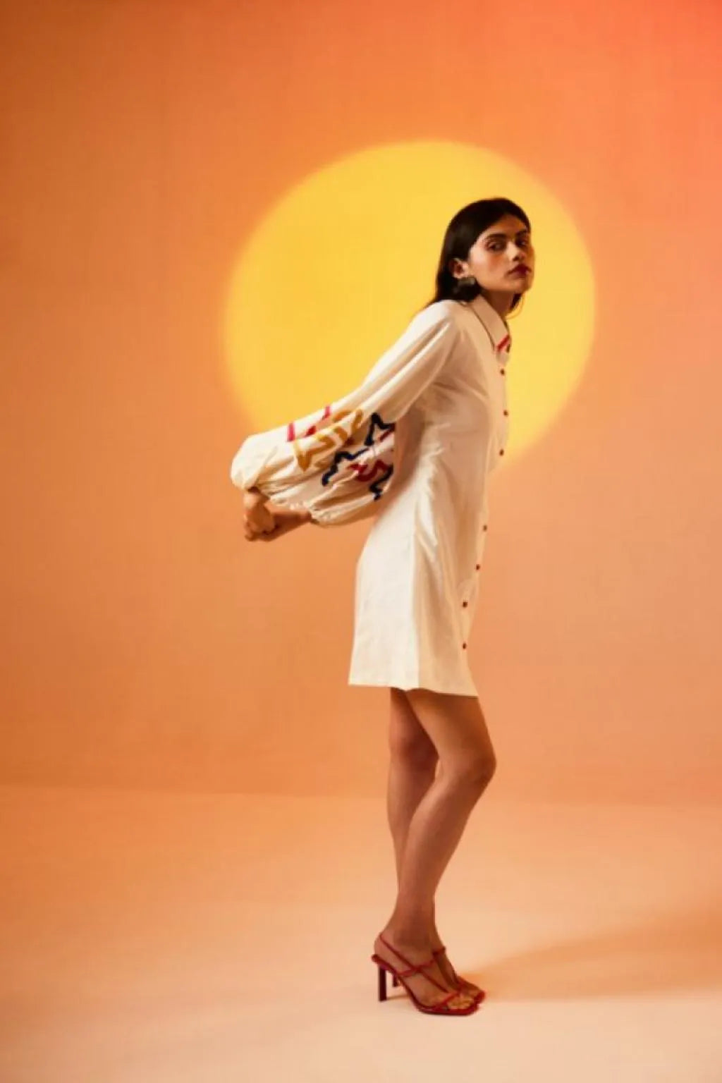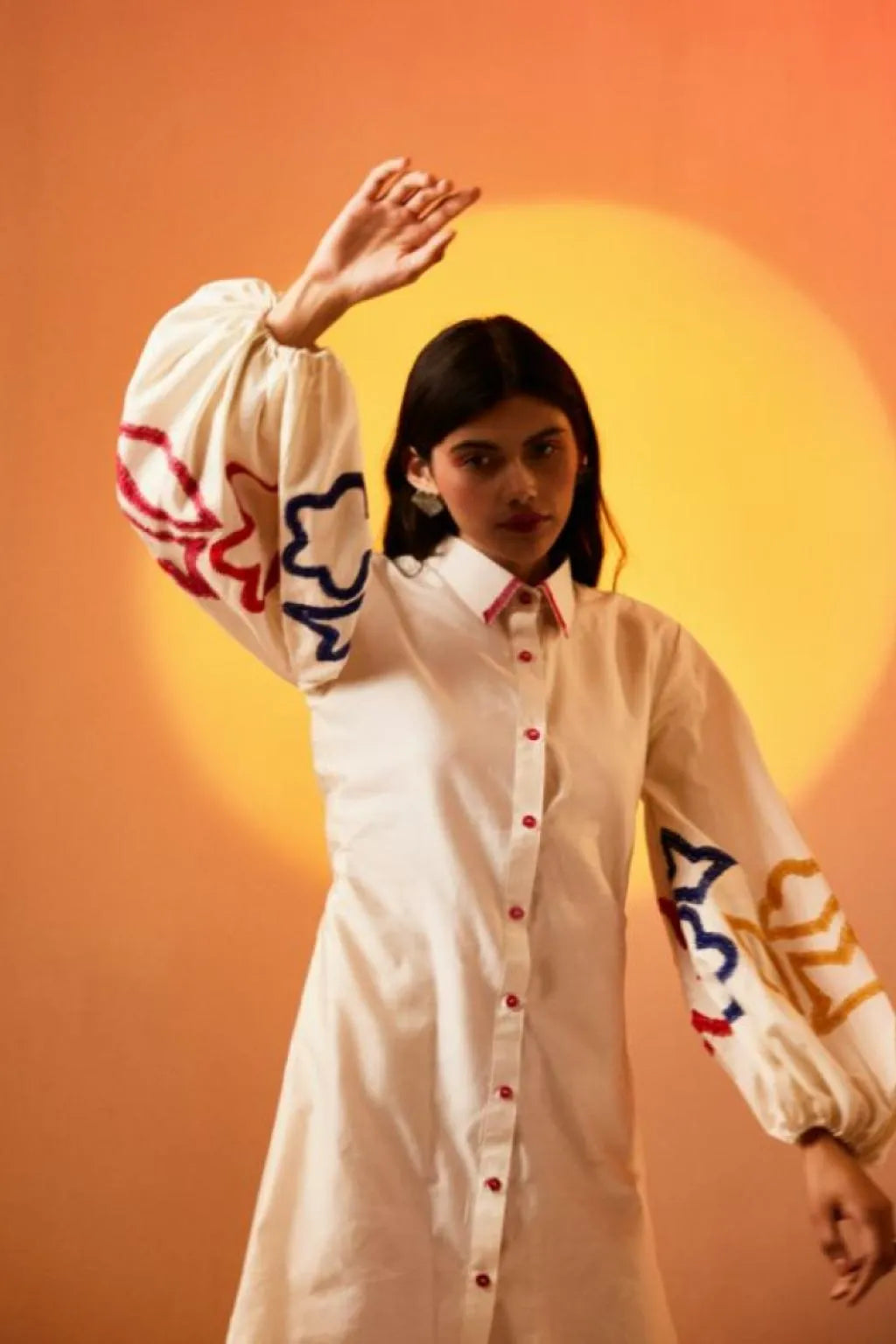 The dress has front buttons and has a great fit . The multi-color floral embroidery on the sleeves adds a delightful contrast, making a bold statement. This dress effortlessly transitions from daytime events to evening soirées .Embrace your feminine side with the delicate floral thread work that adds a romantic and charming touch. The white backdrop enhances the vibrancy of the colors, creating a visually appealing and harmonious design.