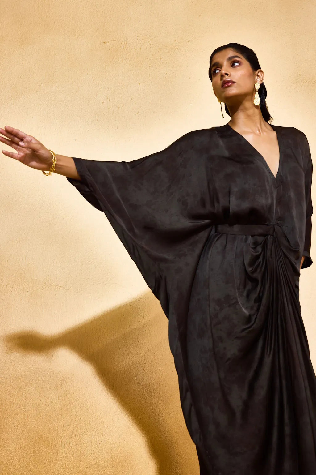 Minimalist in tone, maximalist in detail—the Echo Ash Dress is a contemporary classic. Designed in a muted ash hue, this dress features clean lines, fluid draping, and a flattering silhouette that skims the body with elegance. Crafted in a lightweight, lustrous fabric, it flows with grace while maintaining subtle structure. Fluidity meets form in the Echo Ash Dress—a modern drape-style silhouette designed for the effortlessly elegant. this dress features relaxed kaftan sleeves that flow beautifully with every movement. The half-belted waist subtly cinches the form, adding structure to the otherwise free-flowing silhouette.