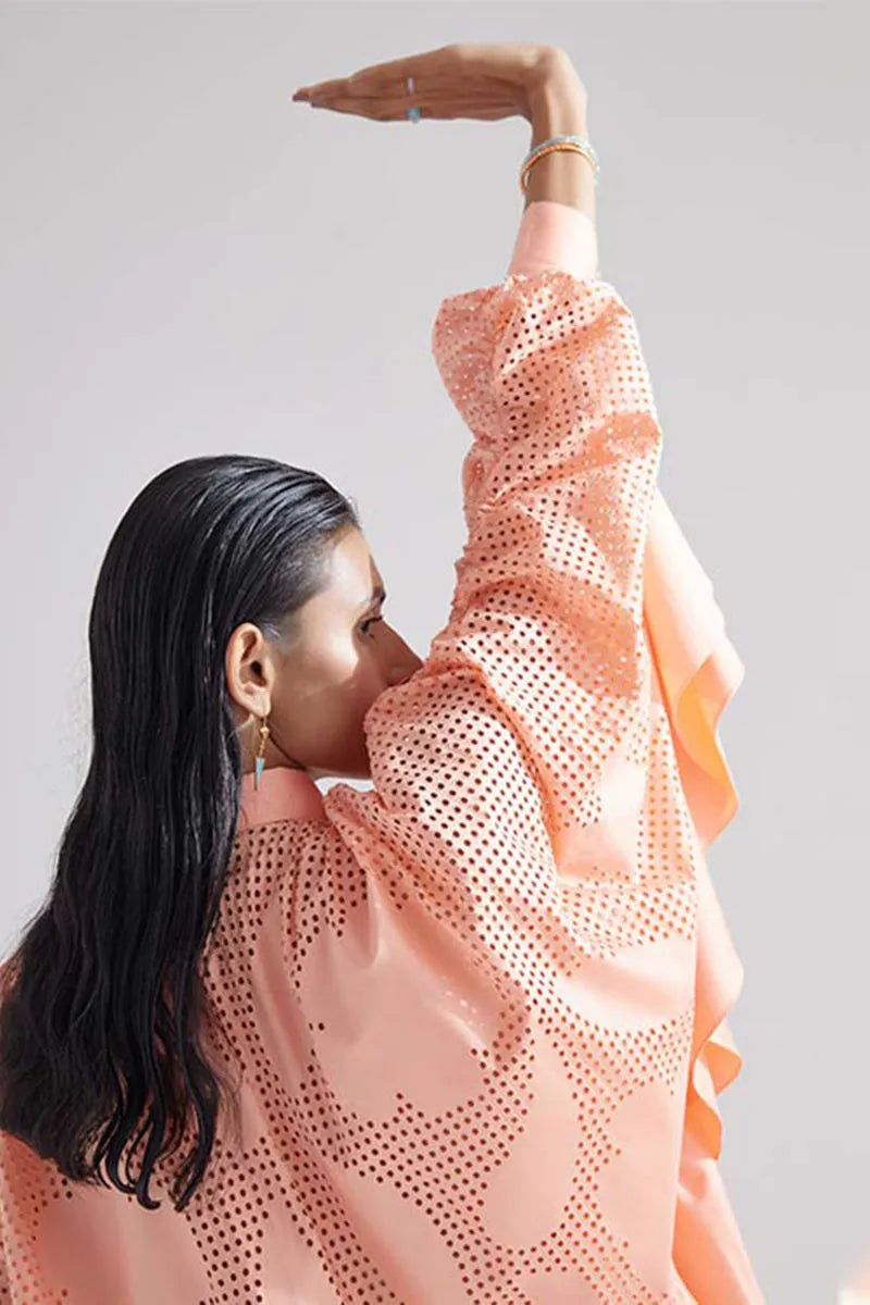 The camellias flower dress if flowy and relaxed . the laser cut pattern spreads across the dress . designed to perfection the garment flows beautifully . the frill added to the bottom giving it length add character to the garment . the dress is a front button down . flower shaped buttons in the front add to the look of the dress . the dress does not require lining . cut in cotton satin the dress is comfortable and light . ruching is added to the sleeves that make the piece interesting. this statement piece is great for any occasion and is designed keeping in mind all body types.