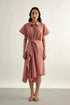Cut in layers . The fit is flattering and unique . The top is draped. The dress has front buttons, collar and side zip closure . The dress is easy to wear and has a unique fall . The bottom is cut in 3 layers . One drape falls and folds , the other is gathered and a third drape falls on top and ties on the waist. This dress is crafted in cotton .The look and feel of the dress is luxurious and comfortable . this dress transforms easily from day to night because of its cut ,color and fit.
